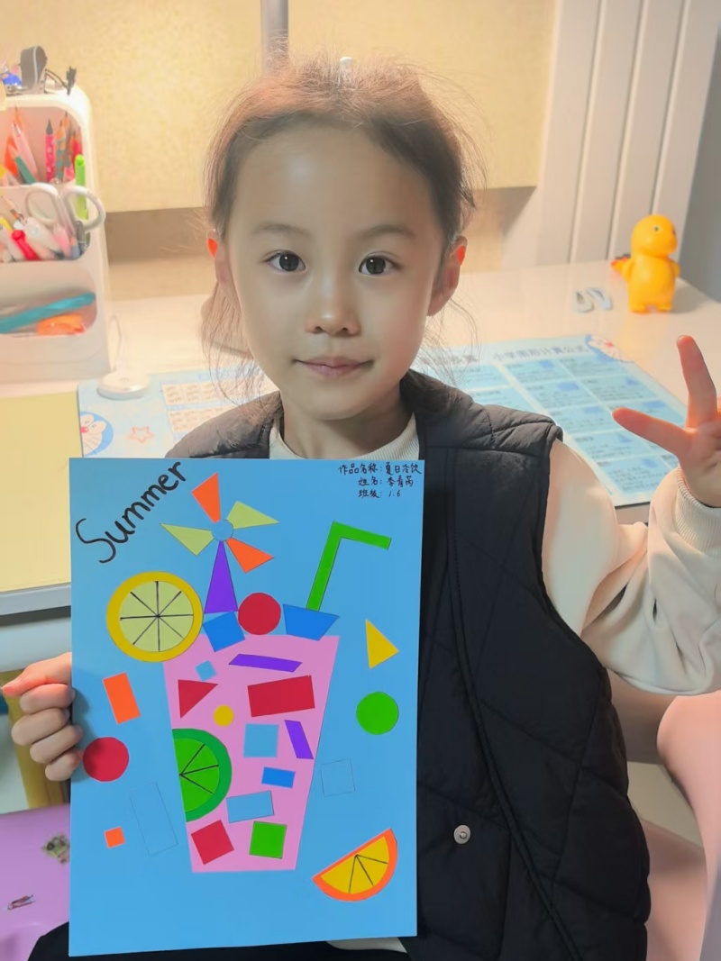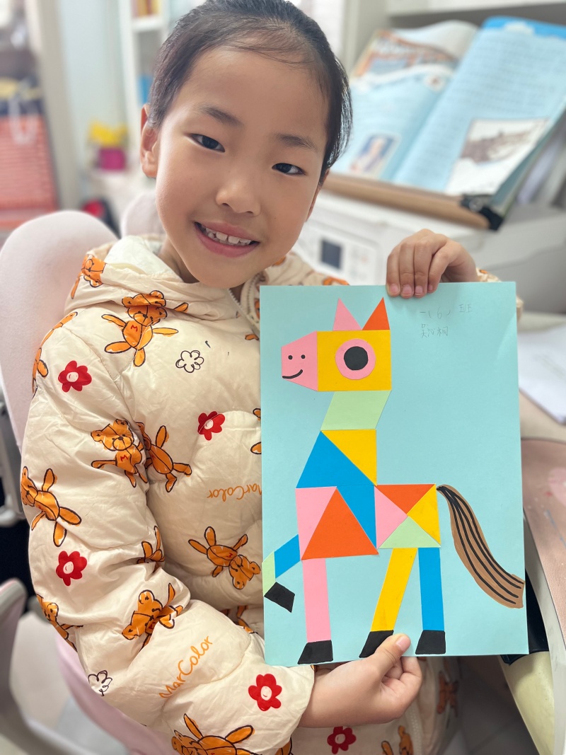 几张彩纸,一把剪刀,一个固体胶水,在家长和孩子们的巧手下,变成了大小不一、色彩斑斓的图形积木。孩子们化身“小小设计师”,充分发挥想象力:灵动的小动物跃然纸上,缤纷的花朵悄然绽放, 酷炫的交通工具整装待发……每一幅作品,都是独一无二的创意童话;每一个图形,都承载着孩子们对美的理解与向往。