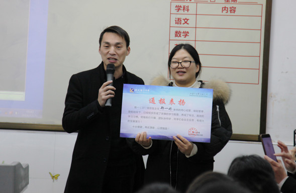 送去祝福,寄语学习进步 高一年级部主任李坚借此迎新之际到各个班级送祝福,同时给班主任送上表扬的牌子,以表扬过去一年所做的努力,争取2019年获得更大的进步