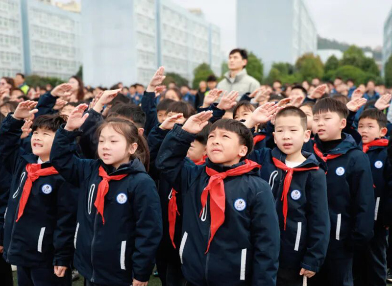 鼓声阵阵。永嘉翔宇小学,温州翔宇中学初中部和高中部,三学部学子誓言如雷,航模队编队腾空而起,《歌唱祖国》的旋律响彻苍穹。
