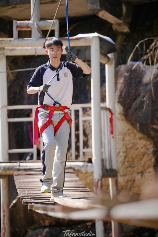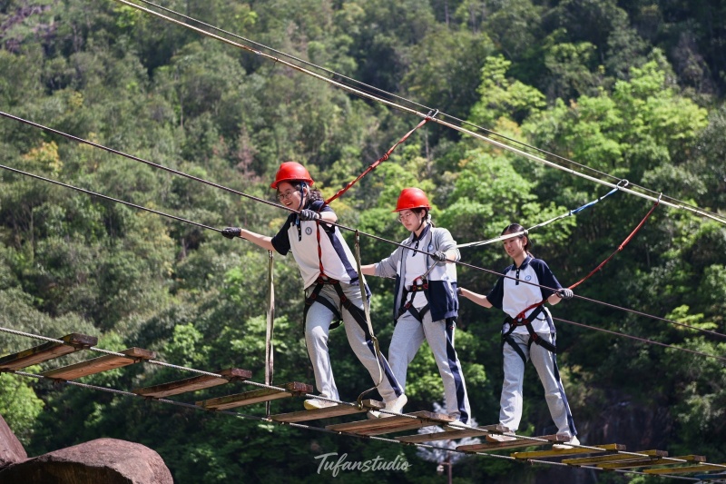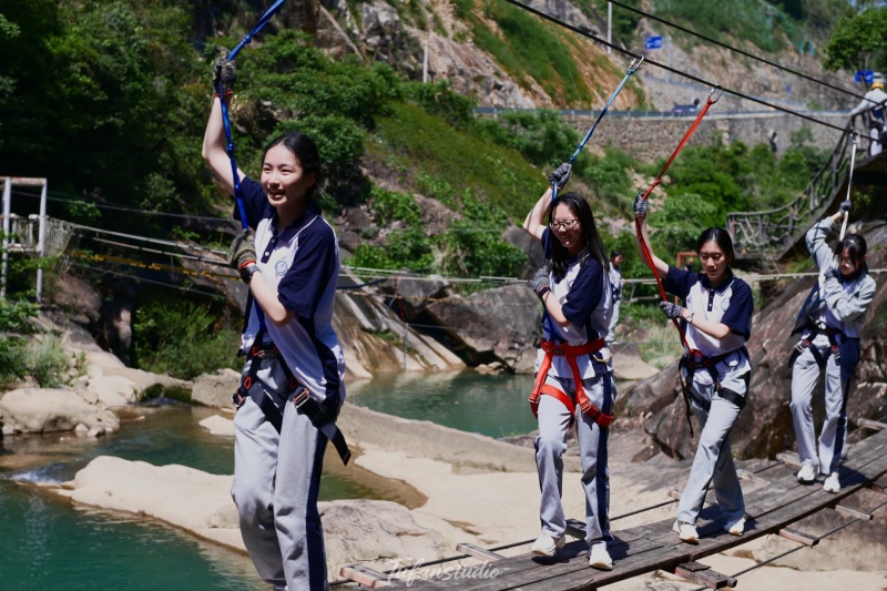 中午享用过当地特色午餐后,队伍前往【九溪欢乐谷】,开展本次活动的重头戏——峡谷穿越拓展项目。在专业教练的指导下,同学们分组进行挑战,内容涵盖峡谷栈道穿越、水上闯关、团队协作游戏等。溪谷之间,清流潺潺,同学们相互鼓励、携手前行,时而攀爬绳索,时而跨越险滩,既考验了个人的勇气与体能,更锤炼了团队的默契与凝聚力。