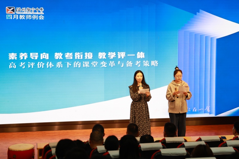 2026年4月30日晚,温州翔宇中学弘景楼报告厅内灯火通明,高中部全体教师齐聚一堂,召开以“素养导向・教考衔接・教学评一体”为主题的教师例会。会议由罗欢、刘倩老师主持。