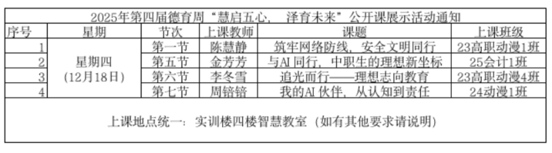 12月18日,永嘉县第二职业学校成功举办了以“慧启五心,泽育未来”为主题的第四届德育周主题班会公开课活动。本次活动旨在通过公开课的形式,集中展示各年级在理想信念、品德修养、行为习惯、心理健康及社会责任感等方面的育人成果,促进班主任队伍专业能力提升,营造全员、全过程、全方位育人的良好氛围。本次活动由陈慧静、金芳芳、李冬雪、周锫锫四位班主任依次开课,全体班主任参与听评课。